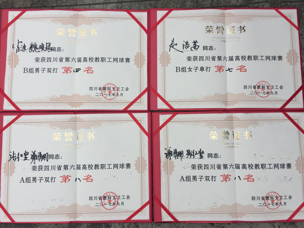 2017年9月22-23号,由四川省委教育工委、四川省教育厅、四川省教科文卫工会主办,西南财经大学承办的第六届全省教职工网球赛在西南财经大学柳林校区网球场开赛。该项赛事一直以来深受省教育厅领导及各高校的重视,比赛共有来自全省38所高校的294名运动员参赛,包括男单、女单、男双、女双、混双,并分为45岁以上及45岁以下、校领导三个组别。