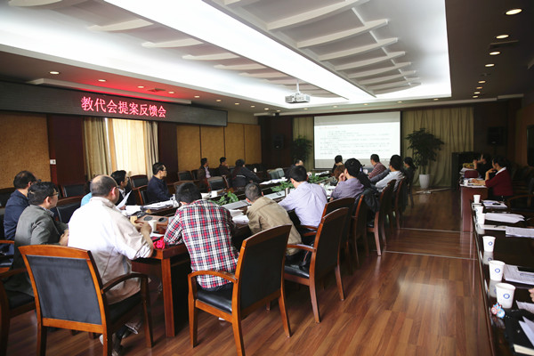 4月18日,学校教代会提案反馈会议在行政楼第七会议室召开。党委副书记倪鸣,副校长于世祥、何建新,相关职能部门负责人,教代会执行委员会和教代会代表们以及提案人参加了会议。会议由学校教代会提案委员会主任羊裔高主持。